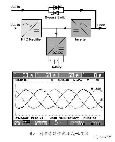 3超级旁路优先运行模式(E变换模式) 施耐德公司在2012年获得了超级旁路优先模式(E变换)的专利。如图3所示,正常情况下,逆变器与旁路市电并联工作,相当于有源滤波器,逆变器提供谐波电流和无功功率,旁路市电回路提供基波电流和有功功率。输出电压由旁路决定。这种模式的优势是整流器和逆变器的功率器件流过的电流较小,元器件疲劳老化轻微,寿命延长,UPS可用性提高。由于逆变器一直在并联运行,当旁路市电超出窗口范围时,系统会0ms切换回逆变器工作,不存在切换失败切换时间长的问题。该种模式效率高达98.8%,仅次于ECO模式。另外,由于可控制旁路回路只提供基波电流和有功功率,因此输入功率因数0.99,输入谐波电流<5%。 目前主流一线品牌厂家在三相大功率UPS系列上均与E变换技术类似的运行模式,供用户选择使用。