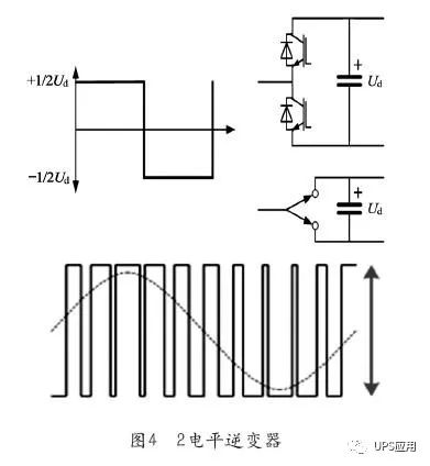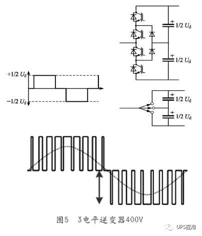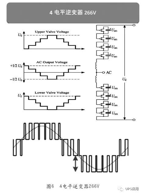 工频机和早期的高频机均采用两电平逆变器技术。如图4所示。 工频机采用变压器交流升压技术。工频机一般配置32只12V电池,浮充状态下直流母线电压432V,较低,只能逆变出160V交流电,只好在逆变器后端采用升压工频变压器,输出220/380V交流电。逆变器功率器件的承压为432V,较低,选用800V耐压值的IGBT即可满足要求。 高频机采用DC/DC直流升压技术。高频机一般配置40~64只电池,为取消变压器,保证逆变器可以直接逆变出220V/380V交流电,高频机在整流器后增加了一个IGBT的DC/DC升压环节,使得两电平逆变器前端的直流母线电压达到800V,这样逆变器功率器件的承压为800V,需要选用1500V耐压值的IGBT才能满足要求。 通过研究场效应管和IGBT等功率器件的失效率曲线,发现1500V耐压值的功率器件其失效率数倍于800V耐压值的功率器件。这样,研发人员意到降低功率器件的承压从而选择低耐压值的功率器件理论上可以提高逆变器的可用性。用户体验实践也证明工频机逆变器比两电平高频机的逆变器可用性高。为改善高频机的可用性,业内研发了三电平四电平逆变器。 如图5所示为三电平逆变器功率器件的承压为400V,低于工频机。 四电平逆变器功率器件的承压为266V(见图6),远低于工频机的432V。 施耐德公司于2010年获得了四电平逆变器技术的专利。该技术的运用,不但提高了逆变器的可用性,还提高了UPS效率,达到96.5%。 那么是否五电平、六电平逆变器的可用性会更高呢,答案不是这样的,因为电平数越多,逆变器需要的功率器件的数量就越多,使得逆变器出故障的可能性增多。因此,需要在功率器件的耐压值和数量上找到合理的平衡。实践证明运行在全球范围内的数万台四电平逆变器可用性大大优于传统的工频机。