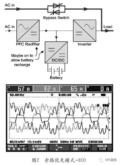 2旁路优先运行模式(ECO模式) 如图2所示,在正常情况下,UPS优先运行在静态旁路,由市电直接给负载供电。当旁路电压超出设定窗口范围时,会切换到逆变器输出模式。该模式的优势是效率高达99%。劣势是由于市电直供,会产生双向*,输入功率因数输入谐波电流指标较差。更重要的是,当旁路故障需要切换回逆变器模式时,会出现4~20ms的切换时间,某些情况下会造成负载运行中断,极大地降低了UPS的可用性。 在这种情况下,能否找到一种运行模式,既有高可用性,还能提高运行效率,同时性能指标参数也能满足负载要求,就成为各厂家研发的重要目标。
